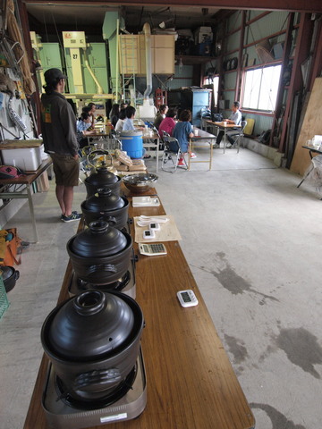 画像下:スタートは作業場での講義から。巨大胚芽米カミアカリの炊飯ワークショップもアンコメ長坂が行いました。