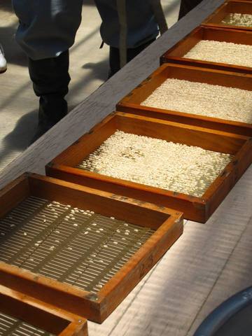 画像下:0.1ミリづつ米粒を篩別けする手作り装置。まるで指物のよう。