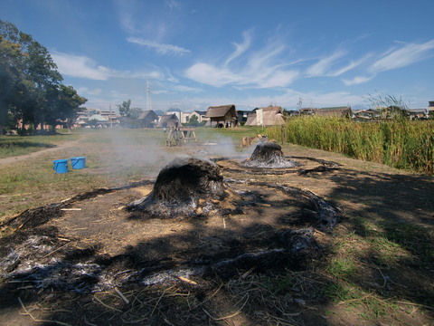 9月21日アートロ4は土器野焼き。土器を稲藁と籾殻でくるみながらドーム状の釜を作り、上部に田んぼの泥で覆いをするように蓋をする。稲藁と籾殻が燃える火力はじっくりと土器を焼き締める。夕方になってもその火は消えることがなかった。画像では薪を使用しているが、木を大切に使った痕跡から、薪や柴をむやみやたらと燃やしていたとは思えず、来年は稲藁と籾殻だけで土器を焼こうと考えている。