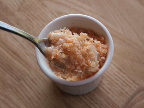カミアカリをピュレに富士宮の柿島養鱒の鱒の中うちをフレークがふりかかってます。