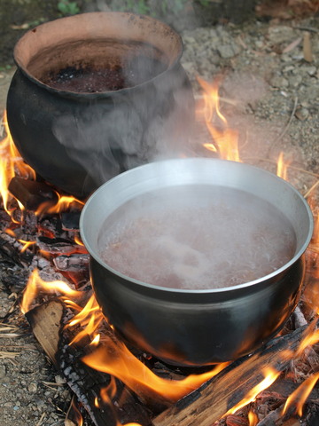 金属ならではの熱伝導の良さで、木が燃える800℃の熱であっという間に沸騰に至る。ちなみに出土する煮炊き用の土器には、なぜか砂が混ぜられていた。当初はその理由は分からなかったが、実験を重ねるうちに、砂の入った土器のほうが沸騰到達時間が早いことに気づいた。つまり2000年前の人たちは知っていたのだ、煮炊きにはこのほうが熱伝導が良いことを。