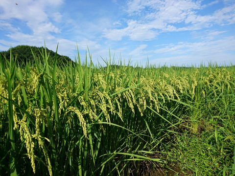 画像中:巨大胚芽米カミアカリ。29年産大久保カミアカリは田んぼの場所を変えた。有機栽培米認定に向け準備を進めているからだ。28年産は苦戦したが今年は順調だ。