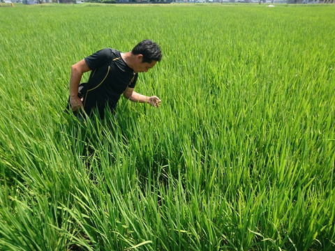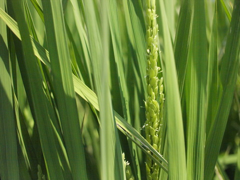 さて、前回8月5日に見た水口の生長遅れは、帰って来たギラギラ太陽でさえも残念ながら解消されぬままになりそうだ。とくに顕著だった「巨大胚芽米カミアカリ」は、かなりの手間だがその部分だけ別に稲刈りするという。なにより品質優先を考える松下にとって、さすがに見過ごすことはできないらしい。「きぬむすめ」についても田んぼによって似たような遅れがあるが栽培期間が一ヶ月以上続くので、もう少し様子を見るとのこと。「にこまる」はちょうど今が出穂のピーク。生長の揃いも良く、今のところ順調そのものだ。暑さ寒さなど天候不順に無類の強さを見せる「にこまる」は有機栽培にとってとても心強く見えた。