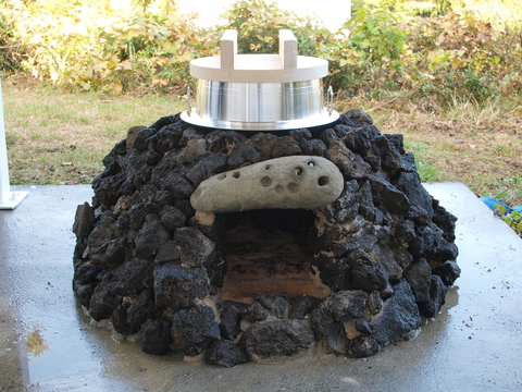 伊豆高原にあるGAKUSHAで製作している竈(かまど)「御神火竈(ごじんかかまど)」が11月15日無事完成した。溶岩石を積んだだけのように見えるその荒々しい姿は一見すると竈には見えないかもしれない。目の前にそびえる大室山を模した形状、素材となる溶岩石も大室山由来の足元にあるものを利用した。また竈内部はまさに火口、設計段階のイメージよりも、はるかにリアルに仕上がった。その完成した御神火竈に真新しい鋳物の羽釜を置いてみる。羽釜が水平になる位置に置くと、羽釜の羽と竈の縁にわずかな隙間ができる。じつはこれは排煙用で煙突の役目をする。正確には煙突のようなドラフトはしないはずなので煙突の役目というのは荷が重いことだろう。けれどその隙間こそ、この原始的な構造の竈の肝になる部分なのだ。燃焼設計をした小谷氏はこの隙間に、わずかながらドラフト風情を吹かせようという魂胆だった。全くもって酔狂だが、デザイン設計をした長坂の無理難題を彼なりに理解し、できるだけ理想の燃焼をするよう考えた結果がこれであった。さてこの竈のお披露目となる初竈開きは来年2021年2月、大室山の山焼きに合わせて行う予定だ。御神火竈で炊かれる御飯や如何に!