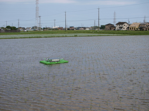 6月4日実証実験がはじまった。2日前に田植えしたばかりの田んぼで実験をはじめた。じつはこのロボット、エンジニア氏の説明によれば除草ではなく抑草とのこと。田んぼを隅から隅まで移動しながら泥をかき回して光を遮断したり、発芽したばかりの草の定着を阻害したりして、草の発生を抑える「抑草ロボ」だという。しかもこのロボが仕事しやすいような田んぼの環境整備があってこその、アイガモロボだということも分かった。それは水田稲作にとっては「いろは」の「い」である、田んぼを平らにすることや、水を漏らさない畔を作ることや、指定された水深に管理すること・・・などであった。僕はそれを聞きエンジニア氏にこう聞いたのだ。