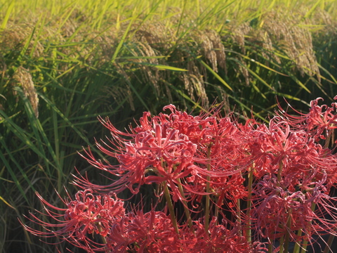 いい具合に日焼けした松下さんがニヤけ顔でこう言った。昨年は食味的には、けっして悪い出来ではなかったが、品質的には今一つ満足できなかった。あのニヤけ面は、そのことが払拭できたことの証拠であることが、すぐに分かった。残るは晩生品種「ハツシモ」と「にこまる」。明日(10月3日)から順次収穫作業が始まる。そこで終盤の雄姿をカメラに納めるべく田んぼへ向かった。傾きかけた日差しでトメ葉が輝き始める。もっさりとした穂を垂れる「ハツシモ」。まだ枝梗は青く「ハツシモ」よりも、もう一週間先にピークがやって来るであろう「にこまる」。いづれもビンビンであることは間違いないことは、ファインダー越しにも分かった。