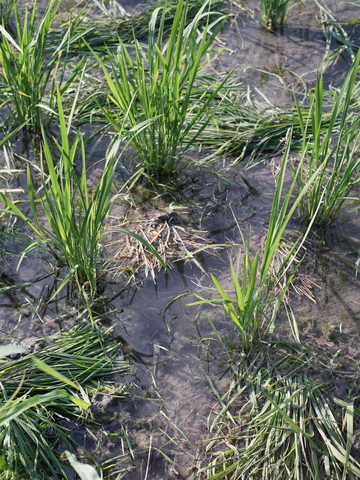 画像下:この時期のヒエの見かけはほぼイネ。明らかにヒエと分かった時にはすでに遅し。したたかなヒエの戦略と言えよう。