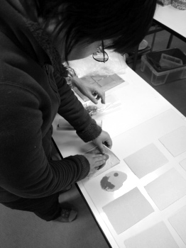 じつは今日、これから制作することになる「NPO法人てのひら」が運営する「グループショップぱれっと」に、第一クリエイティブ社製の真新しい紙漉きマシンが導入されたのだ。導入されたマシンはハガキサイズタイプの小型モデルで、アンコメのエコ米タグは、「グループショップばれっと」の皆さんが、このマシンを駆使して生み出していくというわけです。