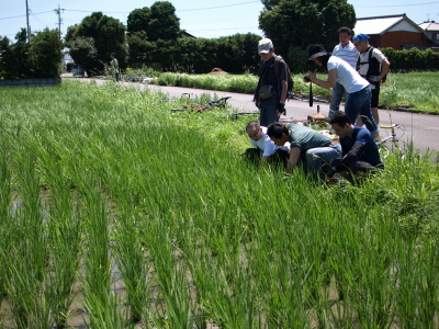 画像下:19日、栽培中の22年産カミアカリを観察中。(静岡藤枝市内松下さんの田圃にて)