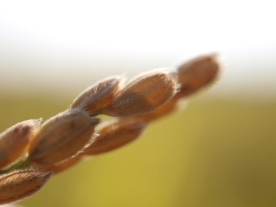 画像中:収穫直前の穂先。大きな胚芽は透かして見える。