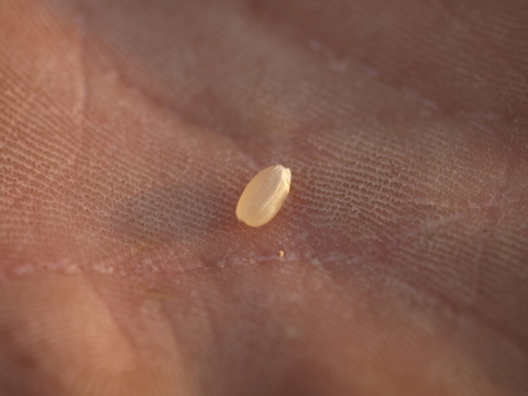 画像中:にこまる一粒剥いてみた。松下の手の中で。