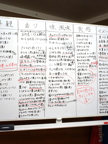 「日なた」「カラカラに乾いたタオル」「土ぼこり」「ほうじ茶」など過去にも時々出てくる言葉や、「納豆」「ミルク」「カシス」「赤ワイン」「小豆」「味噌蔵」「甘酒」などの発酵系の言葉、「チョコレートとイカ」「バナナチップ」「栗」「トウモロコシ」「ビターなココア」「草だんご」また「人肌」「コンクリート」「バンドエイド」などの食品由来ではないが、なるほどと感じる言葉、他に「DLのチキン」「柔らかいそよ風」のようなパーソナルな記憶とつながる言葉表現もあった。