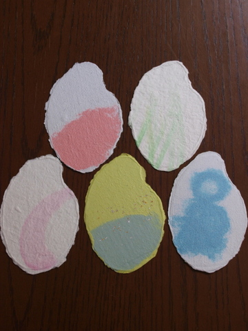 それらをジューサーミキサーでパルプ状にしてから米型に紙を漉く。