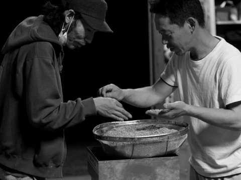 筋まき式の種蒔き機を囲んでじっくり意見を聞く。