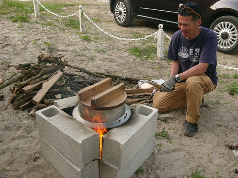 ル・コントワール・ド・ビオス(静岡市葵区紺屋町)でアンコメがカミアカリを羽釜で炊き、おむすびをつくります。