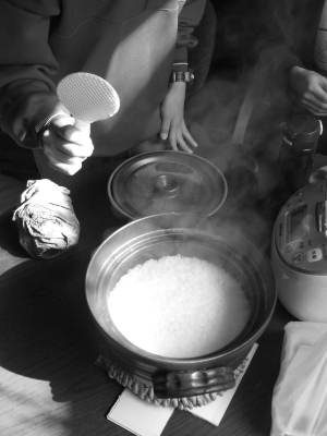 羽釜でカミアカリを炊き、おむすびをつくる。 土鍋でコシヒカリを炊き、たまごかけごはんを…