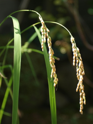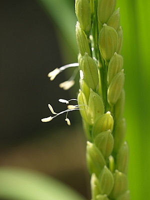 庭にあるマイリトルライスフィールド。カミアカリの稲が開花しています。画像は、その直後のもの。緑色のも…
