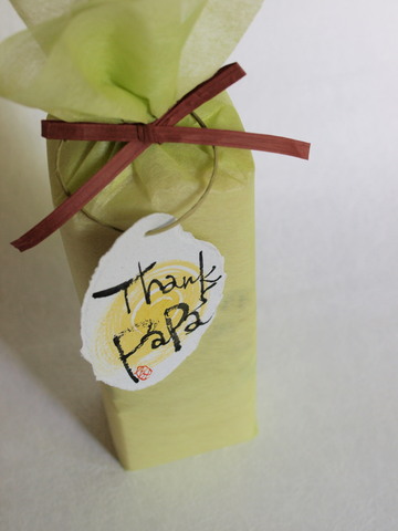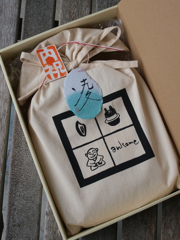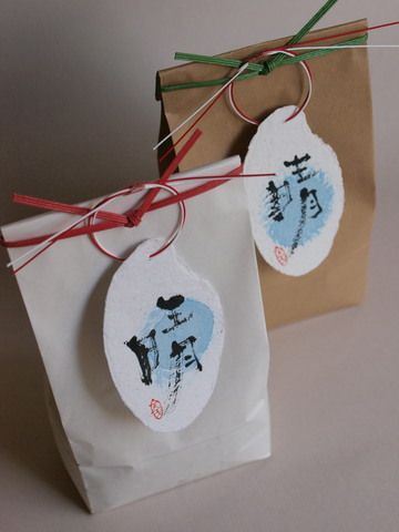 リユースできるコットン地のオリジナル「アンコメ米(マイ)バッグ(※1)」に、お好みのお米をパッケージ。お名前と誕生日、体重などを手描きしたリサイクル手漉き「エコ米(マイ)タグ(※2)」、水引や「内祝い」の印などのデコレーションをします。お米そのものはもちろん、他では絶対マネできないアンコメオリジナルギフトです。