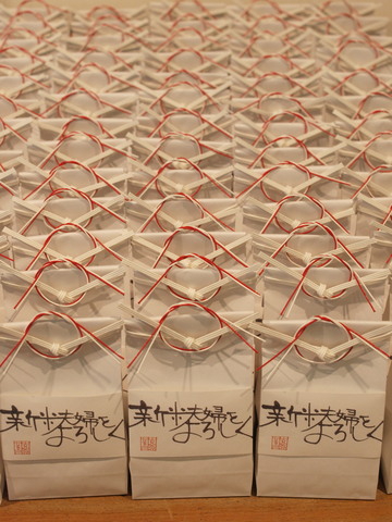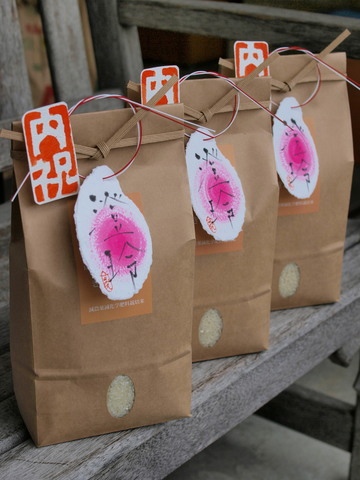 秋から冬にかけては毎年イベントの賞品や景品に使う祝い米を多数作ります。 クラフト袋に水…
