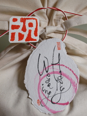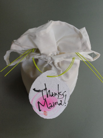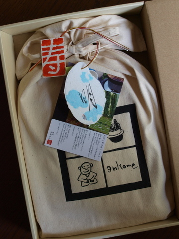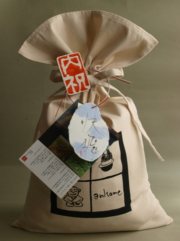 リユースできるコットン地のオリジナル「アンコメ米(マイ)バッグ(※1)」に、お好みのお米をパッケージ。お名前と誕生日、体重などを手描きしたリサイクル手漉き「エコ米(マイ)タグ(※2)」、水引や「内祝い」の印などのデコレーションをします。お米そのものはもちろん、他では絶対マネできないアンコメオリジナルギフトです。